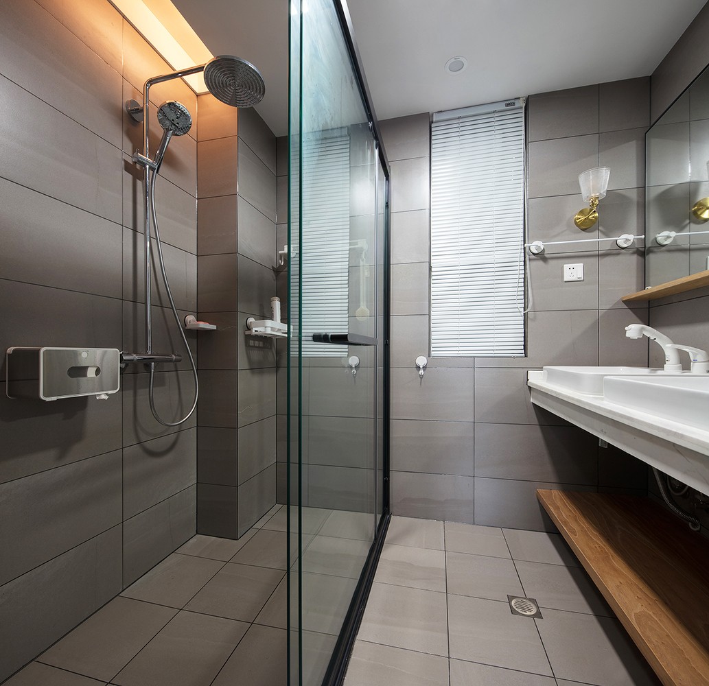 ▲卫玻璃推拉门进行干湿分离,双台盆洗手台下面做了置物层板,方便收纳洗浴物品。灰色方砖延伸的了空间,卫生间更加有质感。