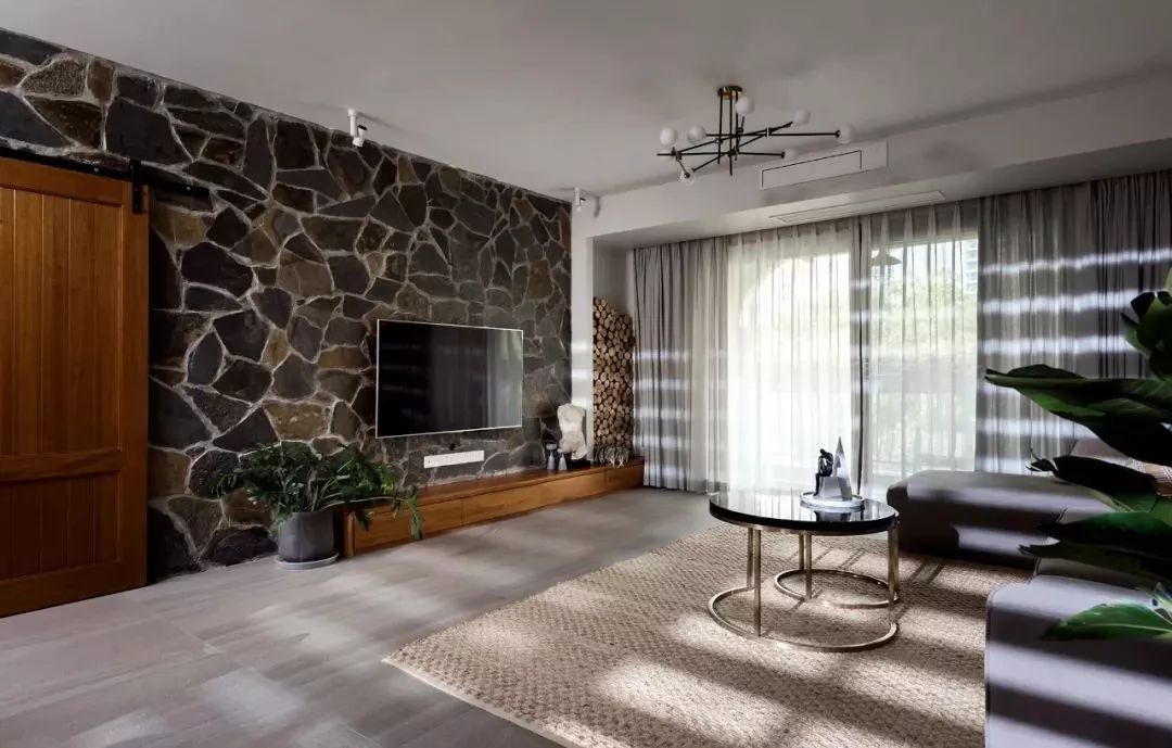 客厅的电视背景墙处用了天然的石块来做装饰,是不是超级有创意呢?再搭配上绿植和堆放的柴火、谷仓门整个背景墙都变得更加复古又时尚。