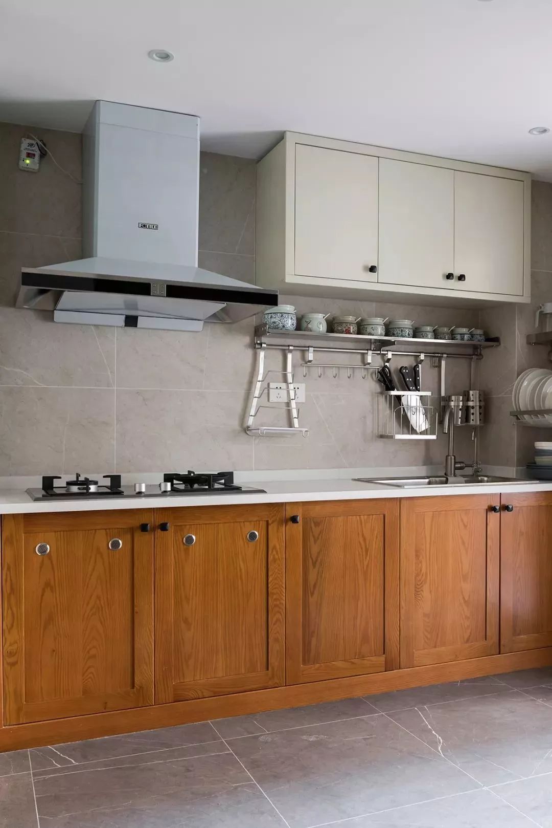 厨房还承担了通道的作用,所以选择做成了一字形的橱柜布局,在橱柜和吊柜之间加上挂杆和隔板、置物篮来辅助收纳,非常实用。