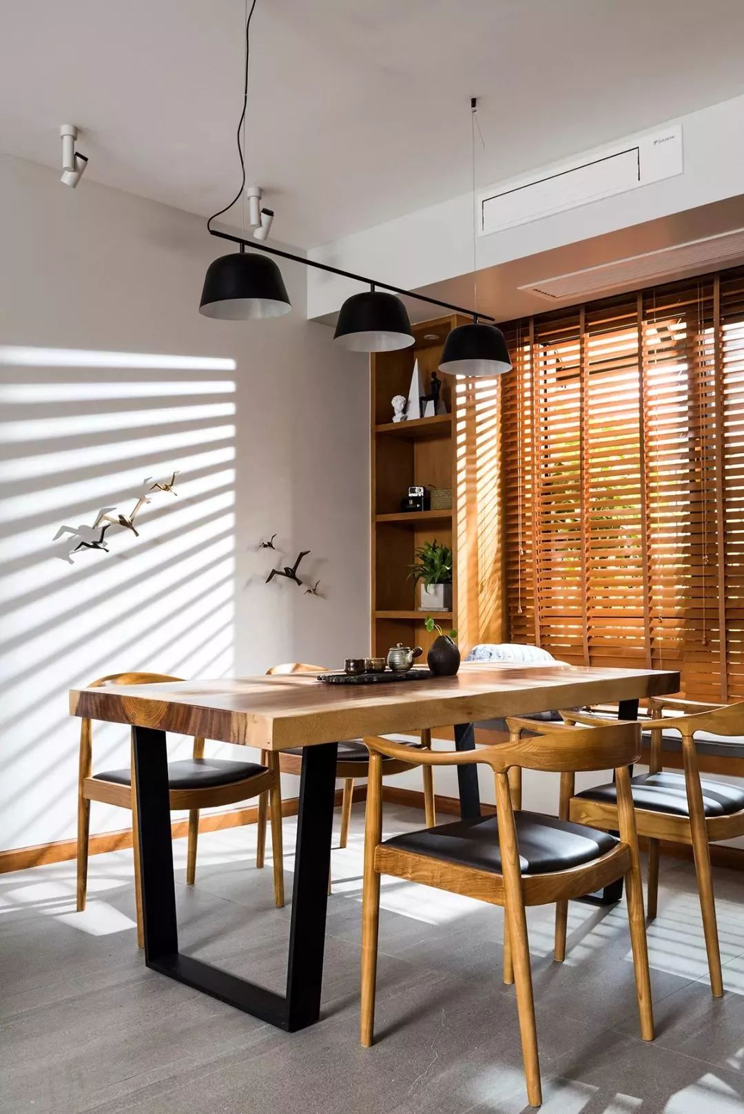 餐厅位于客厅的另一侧,由百叶帘分隔的阳光也能直射到客厅处。墙上的鸟儿搭配木质家具让整个客厅都充满着自然的气息。