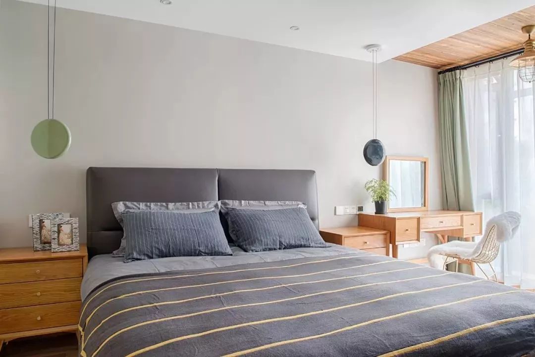 主卧室的床头背景墙刷成了浅灰色,床也选择了灰色调的,搭配蓝色的床品和木色的家具,在简洁当中又展现出了文艺感。