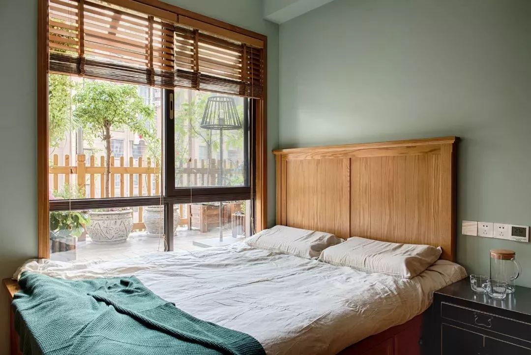 老人房的背景墙选择了更为清新的绿色,紧凑的卧室把床靠着窗户摆放,在这里也欣赏到窗外的美景,每天被清新绿意给唤醒。