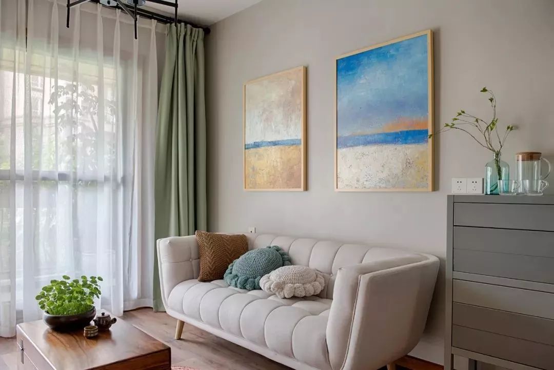客厅的沙发背景墙选择了整体刷白的设计,配合两幅装饰画整体显得美观又大方。灰色布艺沙发配上浅灰色哑光地砖搭配米色地毯,整个客厅的空间变得时尚又简洁。
