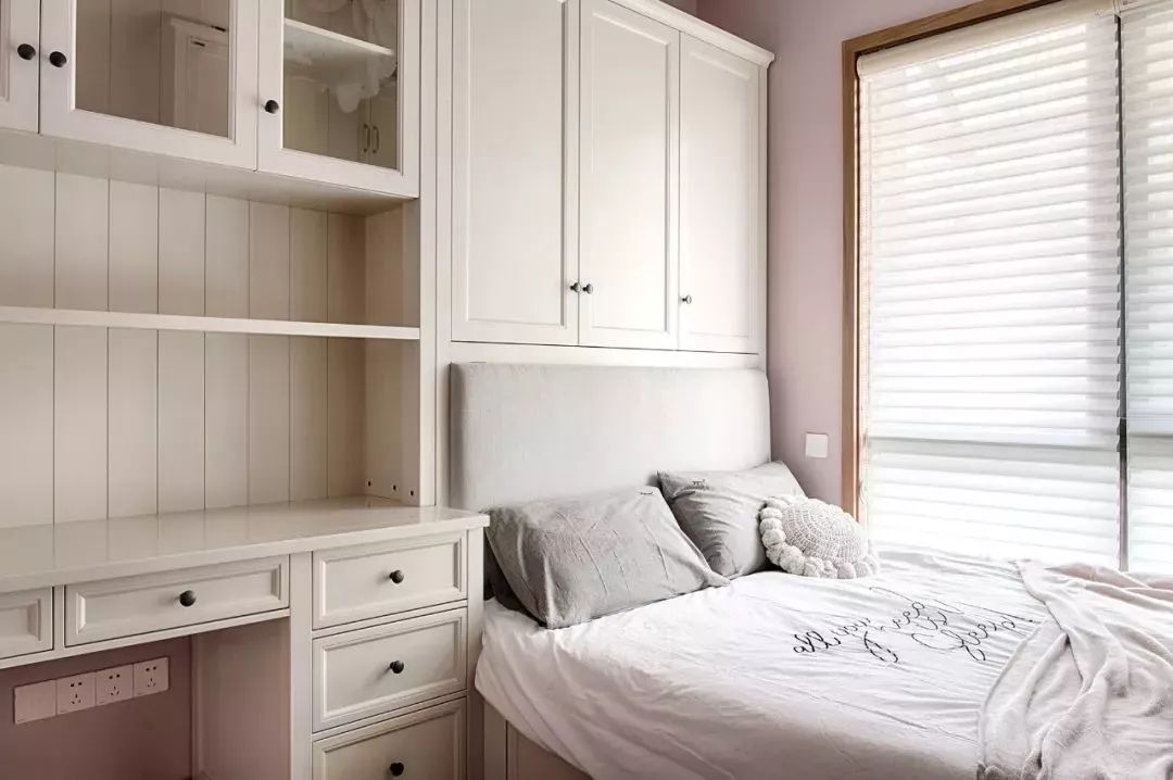 儿童房选择了做成榻榻米组合衣柜和书桌柜的设计,在床头的侧方做上书桌柜,舍去了床头柜又让孩子平时读书学习更为方便。