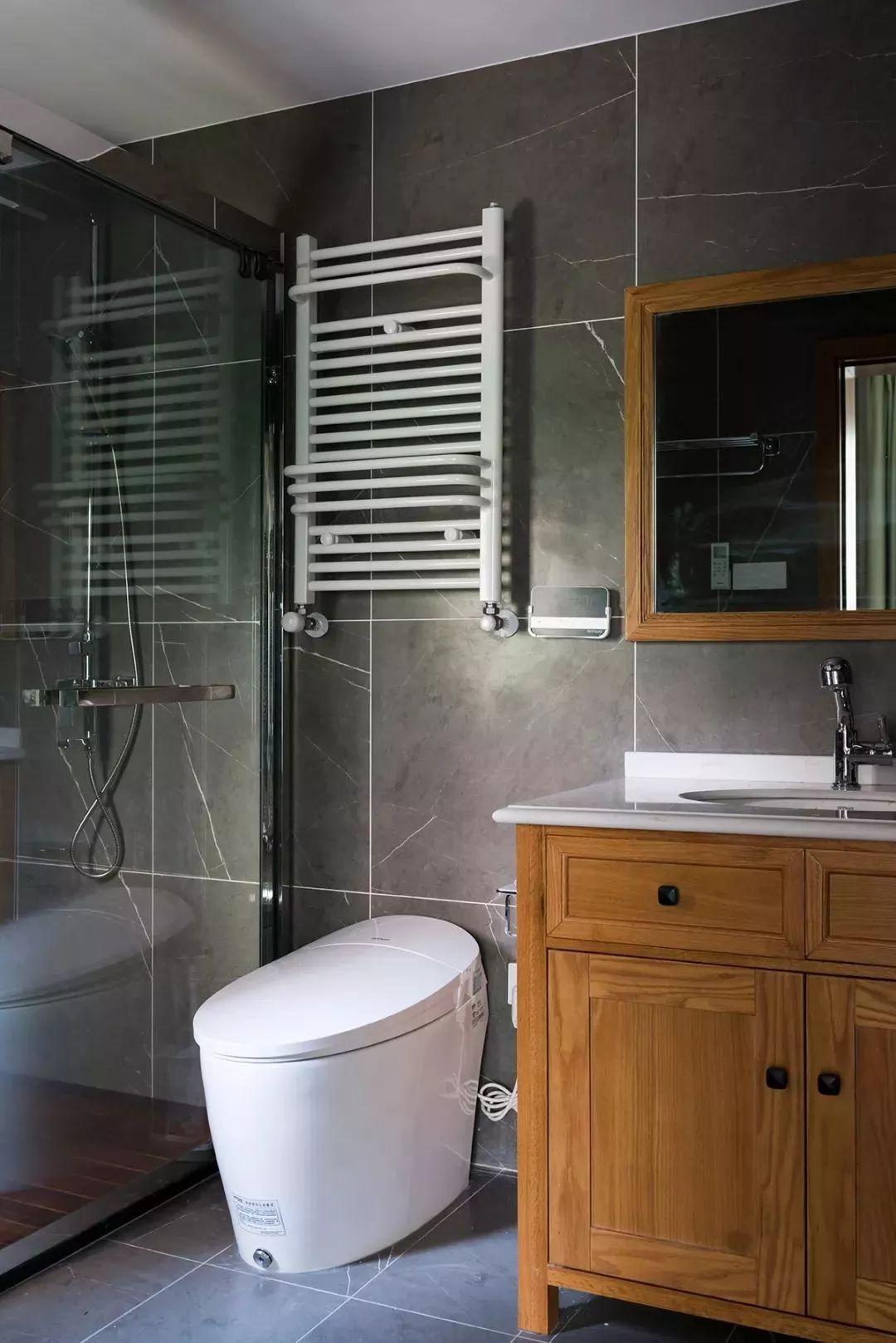 卫生间内部做了干湿分离的设计,深灰色的墙地砖搭配木质的浴室柜的白色的卫具,卫生间也有着足够的采光,让人感觉宽敞而又明亮。