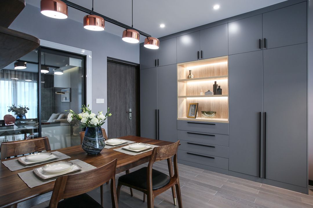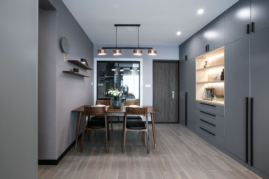 入户玄关和餐厅连在了一起,一进门就可以看到丰富的饭菜。用了入户门侧方的墙面来做上一整墙的柜子,把鞋柜和餐边柜结合在一起使用,节省空间实用感也不少。整体灰色的柜体,时尚大方又干净整洁。