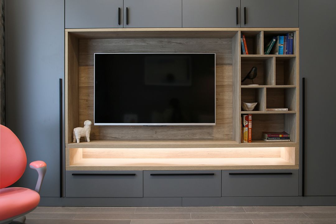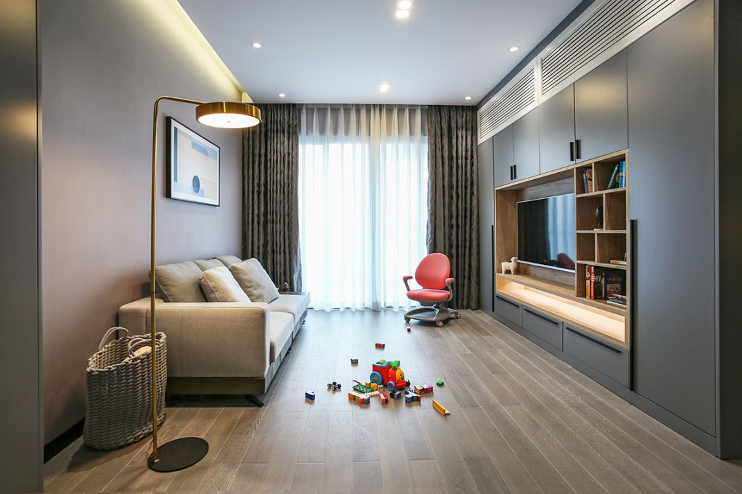 客厅的电视背景墙则是被利用起来做了收纳,内置的柜子中间留空作为电视背景墙以及周围区域,加上了藏光之后显得更大气。也更加方便了。