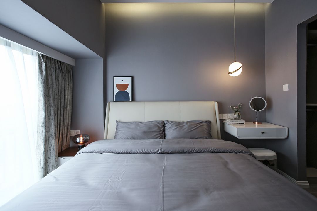 卧室选择了以蓝灰色为主,整体灯光选择柔和的暖色调为主,在卧室顶部吊顶内加上藏光,用吊灯、台灯等代替主灯,让整个卧室空间变得更加温馨。