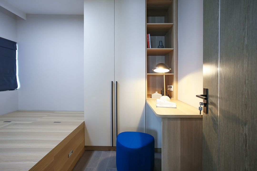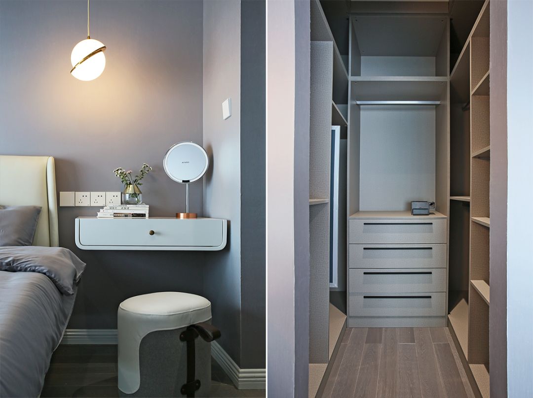 那位女生不想拥有一个衣帽间呢?为了满足这个小小的愿望设计师把主卧卫生间改造成一个迷你的衣帽间。U字形布局的柜子把角落空间充分用上。床头的位置也被改造成一个梳妆台,无腿的设计使用起来更加的方便。也不占空间。