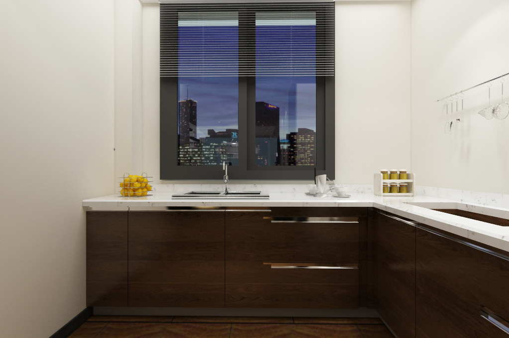 厨房因为的户型原因选择做了的闭门式厨房,用人造石(石英石)来做一个台面把冰箱做成了嵌入式节省厨房的空间。以白色为主,橱柜的颜色用的实木色,让空间的层次感更加丰富也保证了简约的风格。两种颜色的搭配也保证了不让您会视觉疲劳,白色大理石搭配枣红实木色的橱柜庄重又大气。