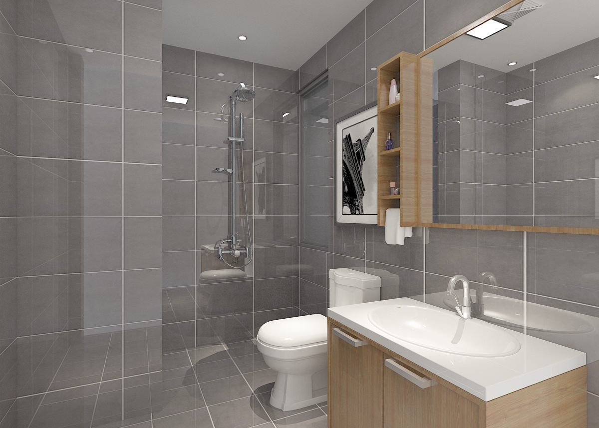 卫生间我们是用灰色的地砖和墙砖作为基础,搭配木色的浴室柜来保证空间层次感也符合简约的风格。灰色背景搭配白色洁具显得简洁又大方。