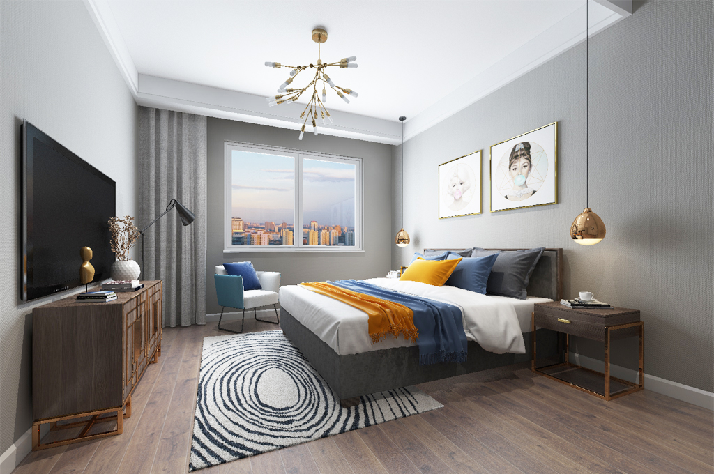 卧室整体背景色以灰色为主,白色作为点缀。灰木色的地板让整个卧室空间变得更加深沉,温馨的感觉一跃而上。床品则选择了亮色作为点亮整个卧室空间的颜色。床头柜和电视柜统一,深色木质柜搭配金属低调又奢华。
