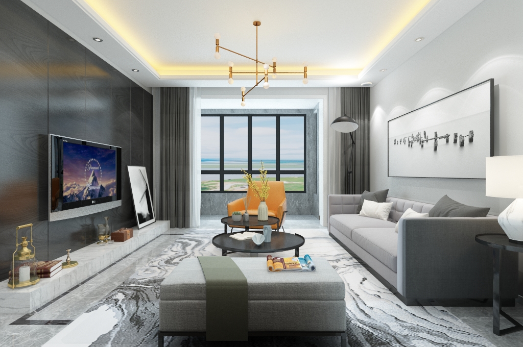 客厅的户型方正,采光、通风都非常好。色调选择了以白色和灰色为主,搭配黑色背景墙,让整个空间更加丰富和层次感。地面采用白灰相间的地砖用一些彩色搭配呈现出简约大气的风格。电视柜选择了和以往不同柜体而是选择了大理石作为一个阶梯式的台阶,用于盛放各种装饰物的地方刚刚好。