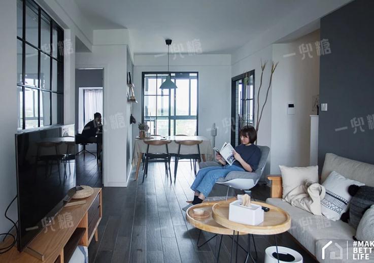 客厅家具在颜色上也主要以灰色、白色、原木色为主,搭配上地面的木纹砖,整体显得比较素净。