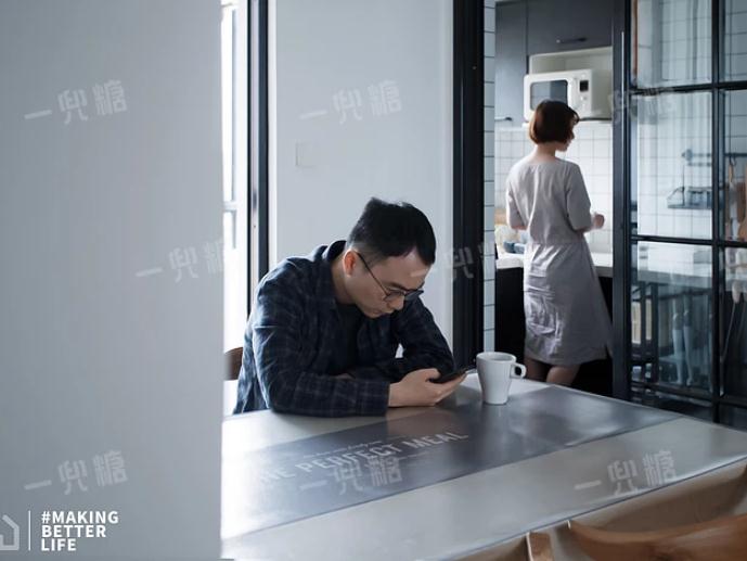 餐厅与厨房相对,由一扇玻璃拼格门分割开来,空间显得更加通透,也增强了餐厨生活的互动感,让生活更有情趣。
