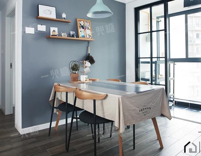 餐桌上摆放了杯具和小巧的盆栽,增条了几分生活氛围。餐边的墙面安置了两个原木色的置物架,用来摆放相框和其他装饰物,让用餐环境显得更加温馨。