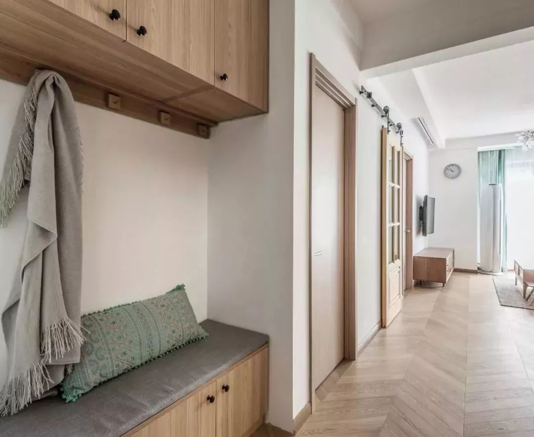 ▲设计师在玄关放置了吊柜和放鞋凳,底部还贴心的放置了挂钩,随手的包包的物品都可以非常方便的放在这里。文艺复古的绿色勾花靠枕在整体都是木色的装饰下,显得非常清新自然。