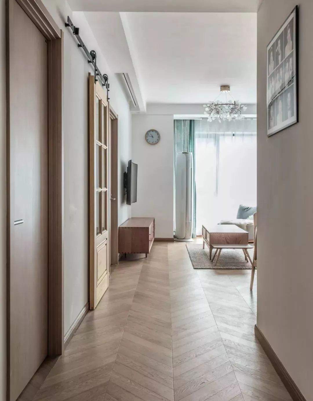 ▲从玄关进入客厅空间,整体的木质家具和门都让整体充满子原始自然的味道。谷仓门的设计在让整体氛围变得更加时尚。