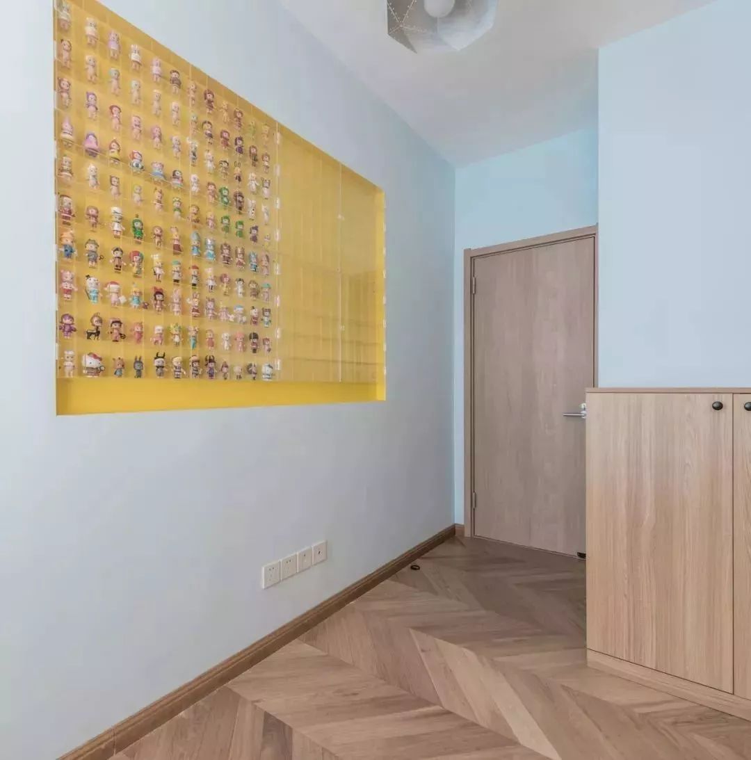 ▲次卧空间也是以简约为主,墙面掏空了一个浅浅的壁洞,以黄色为背景装一个格架收纳,充满着乐趣。