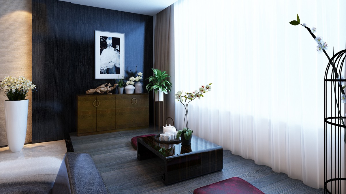 在客厅一侧的阳台设计选择做成休闲区,在这里品茶看着窗外也是极好的。美式风格的小方桌搭配着绿植让人心旷神怡,靠墙面选择放了褐色的储物柜,绿植的存放还是杂物的存放都有迹可循了。