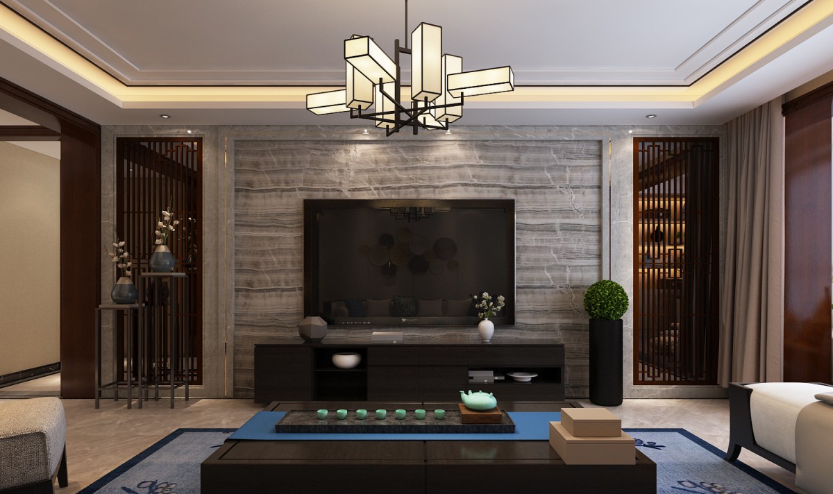 电视背景墙摆脱了常规中式的压抑,将大理石与屏风融合到一起,中西元素的交汇与碰撞,带来了丰富的层次感。电视柜选择了中空设计,对于饰物的摆放起到很好的直观效果。屏风搭配着端景台更有一丝丝中式的质感。大理石的背景墙两侧选择了低调的金色装饰条,美式轻奢就是他了。