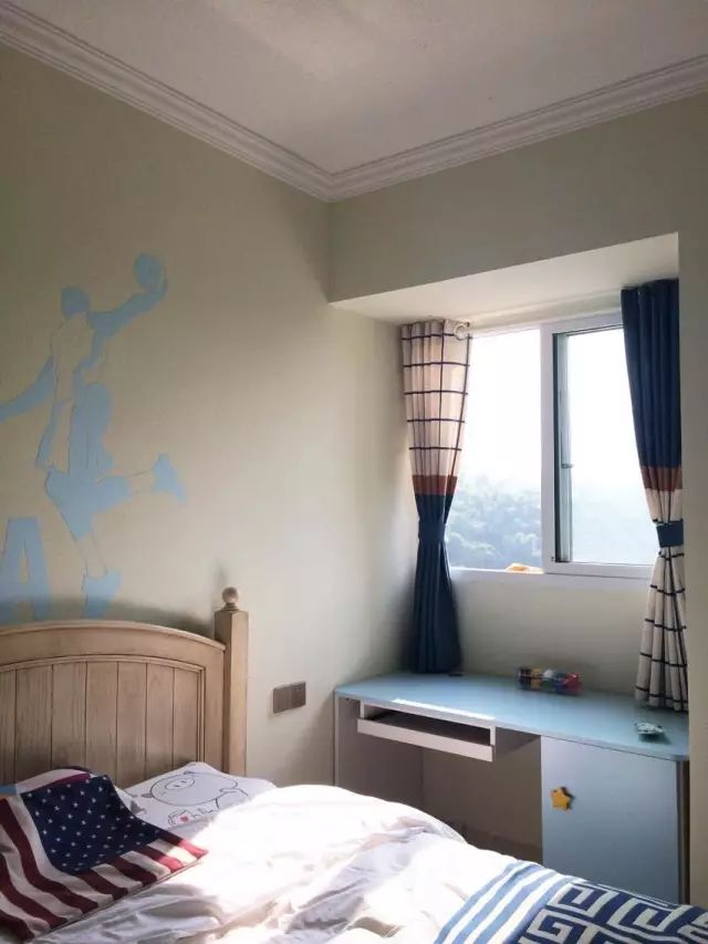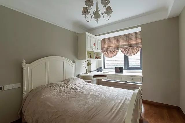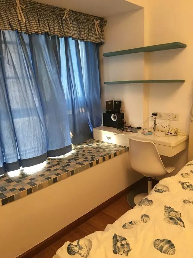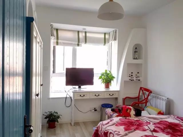 飘窗比较小的,就刚好摆下一个书桌,根据房间的宽度,看是否需要摆下一张椅子,还是直接用床代替椅子,总能做到合适。