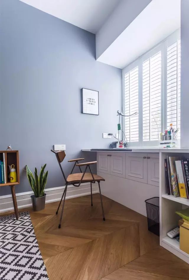 最好还是把飘窗这个位置,完全改成一个小书房,恰到好处的宽度,嵌入一张书桌,收纳空间足够,工作学习都会非常的方便。