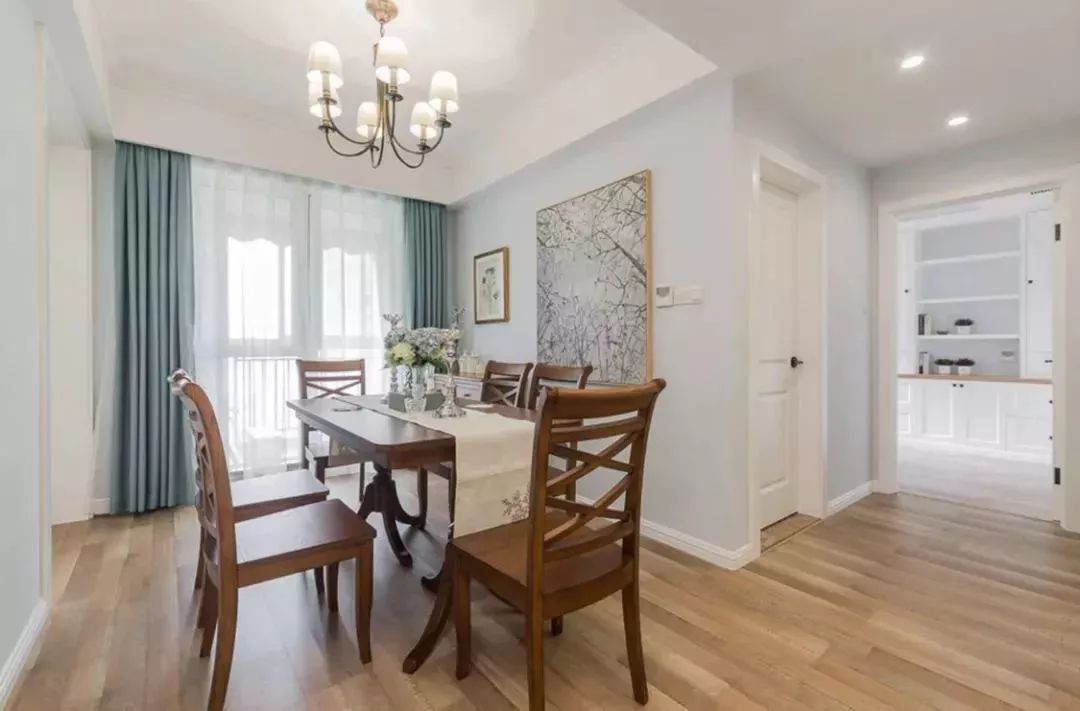 ▲餐厅墙面选择了和电视背景墙一样的浅蓝色乳胶漆在搭配上一套实木的美式风格的餐桌椅,简简单单的就餐空间却显得温馨感十足。
