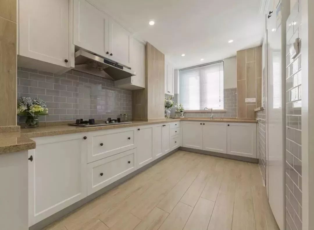 ▲整体L形的布局的厨房,墙面贴上灰色的墙砖,搭配白色橱柜,营造出了一个自然温馨的烹饪空间。