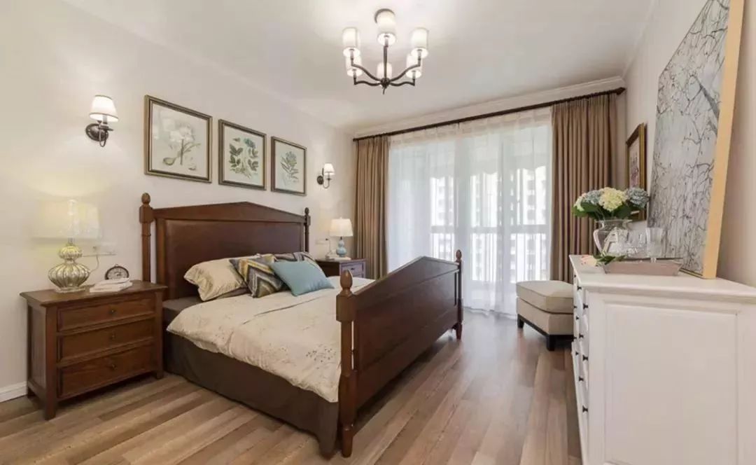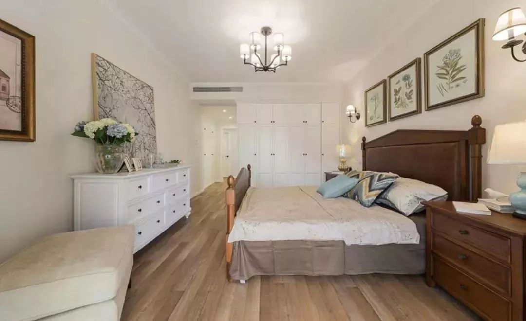 ▲主卧整体就是让人感到很舒服的存在,在浅颜色的木质地板的基础上在搭配美式风格的床体,以软装为主的打造出一个舒适的休息区域。墙面上的壁灯也更好的节省了空间,床头三幅植物装饰画,整体简约又大方。
