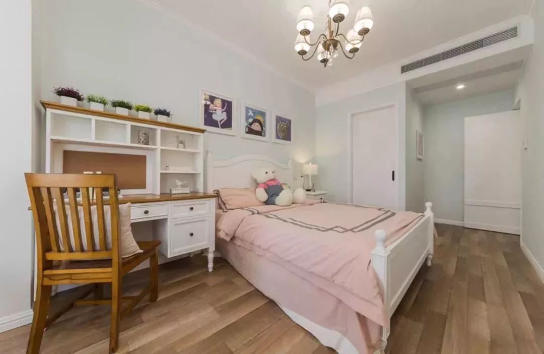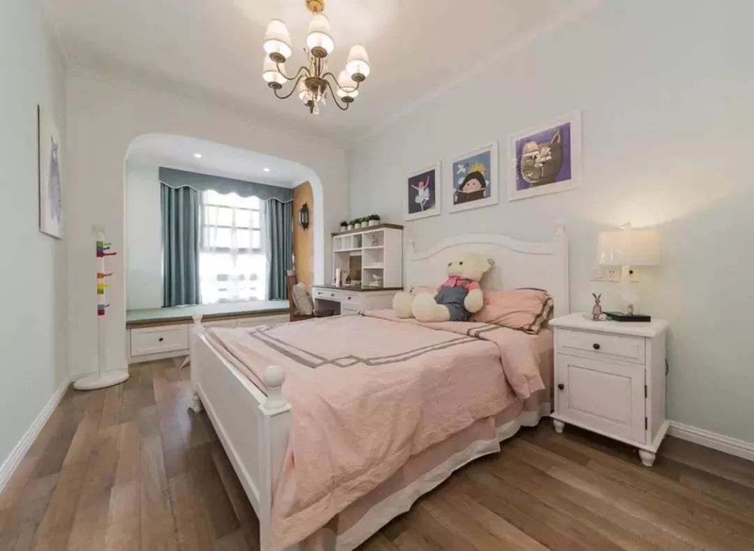 ▲儿童房也是选择了淡蓝色作为墙面主题色,搭配着白色的床和床头柜没有哪一个小孩子不喜欢的吧?搭配着粉色床品充满童趣。