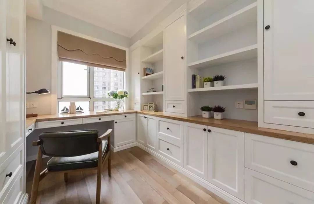 ▲书房整体都被柜体包围,书房完全可以容纳下两个人同时办公学习,结合木色地板与棕色窗帘,营造出一个优雅自然的空间质感。