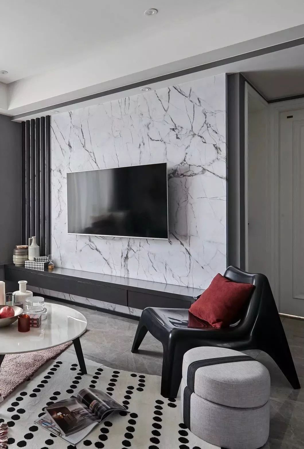 ▲客厅整体用高级灰与烟粉进行巧妙搭配,沙发背景墙点缀柔粉跳色,优雅柔美,电视背景墙铺贴整块大理石,更显高端,飘窗+柜体的设计既满足了主人休闲娱乐又为收纳提供了空间。