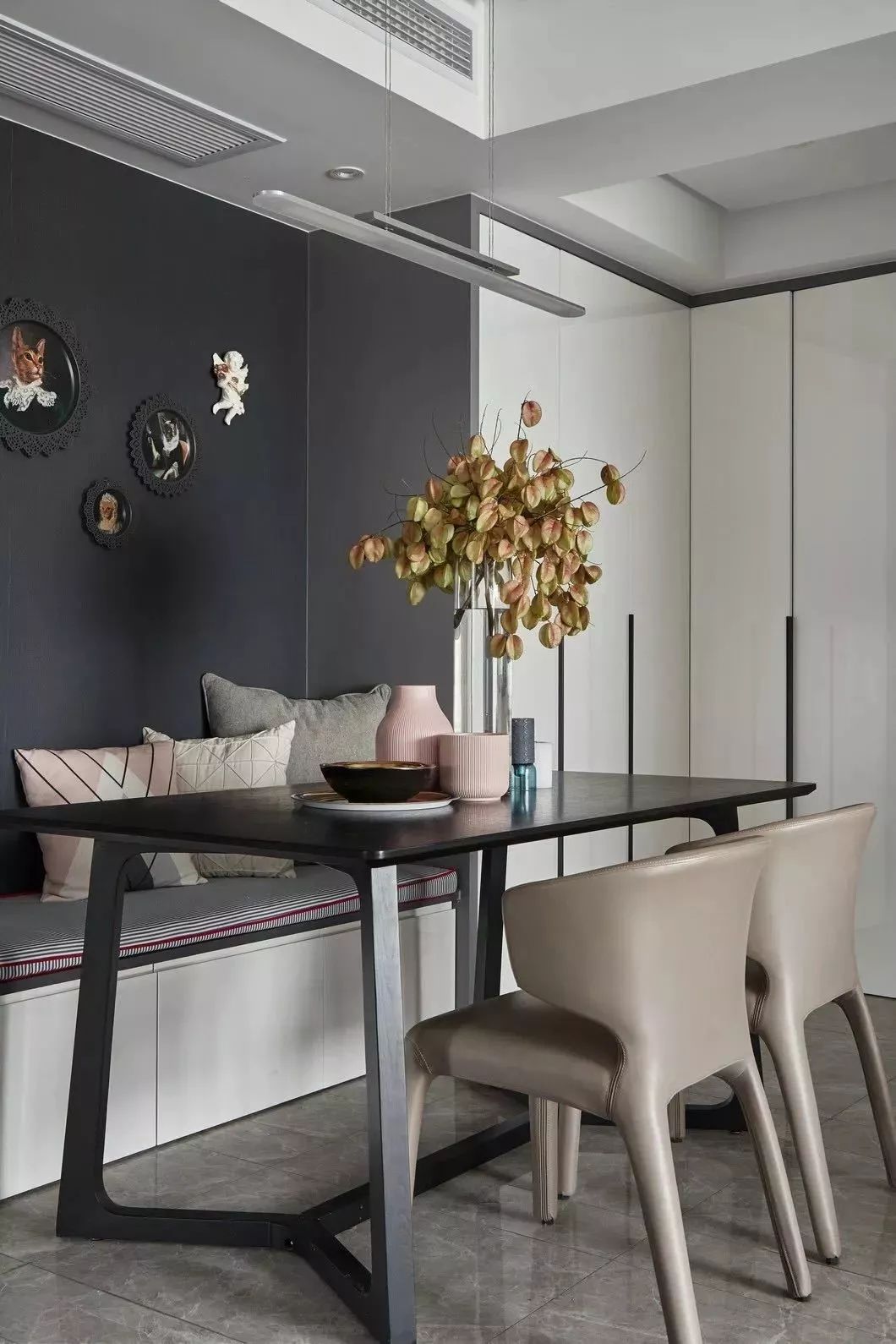 ▲餐厅依旧延续客厅的色彩搭配,软装细节上更显设计师的用心,比如舒适时尚的卡座,背景墙的圆形装饰画、粉色花瓶等等,看似简约随意却无形中相互呼应,黑色餐桌与米色餐椅搭配经典,优雅美翻天。
