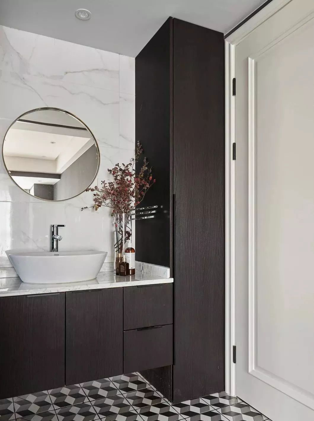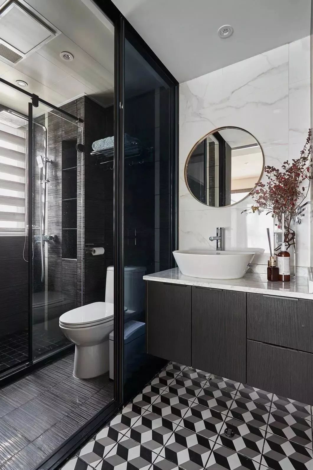 ▲卫浴空间采用当下很流行的三式分离结构,这样设计更方便业主使用,也会延长卫浴空间内的家具使用寿命,黑色橱柜与白色洁具的经典搭配高贵优雅,小花砖更是美的与众不同!