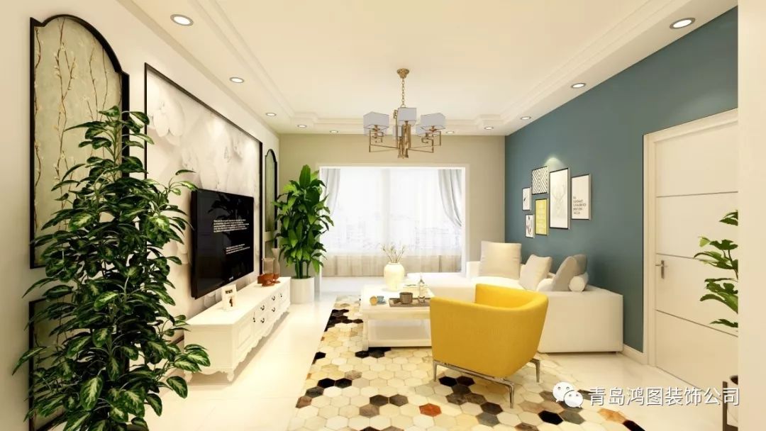 客厅空间,两面背景墙独具特色,蓝色沙发背景墙搭配纯白沙发和简约装饰画,干净清爽,而电视背景墙,素雅壁纸搭配黑色线条勾勒出一股优雅的气质,六边形格子地毯温馨跳跃,又丰富了空间层次,再用清新绿植点缀空间角落,给你满满的舒适享受。