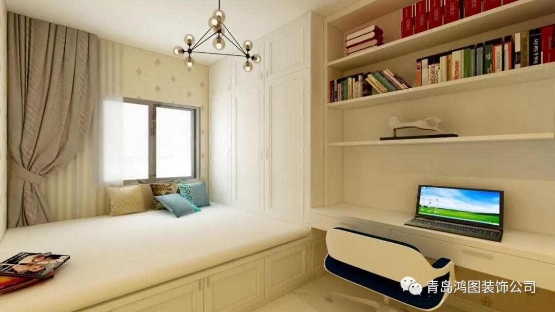 书房设计独特,在靠窗位置装上一个小床,在靠墙位置做一张书桌,让空间的整体感十分的强烈;不但工作休息分明,还可做客房,一房两用,让人十分惊喜。