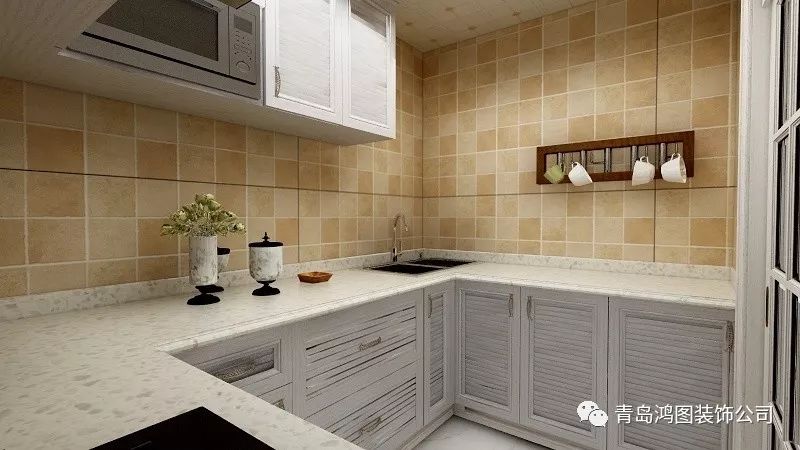 U型橱柜布局,合理方便,黄色的墙砖搭配白色的橱柜,清爽又干练,一切让烹饪变的简单起来。