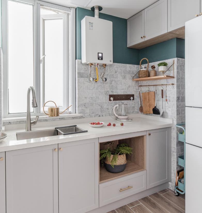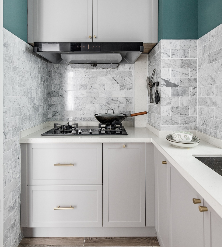 餐厅的地板砖延伸到厨房,这种铺贴在视觉上放大空间。墙面的大理石马赛克采用半高贴法,上半部分是蓝绿色的乳胶漆,丰富了空间的层次。从上到下的同一色橱柜搭配金属拉丝小把手整体又大气。