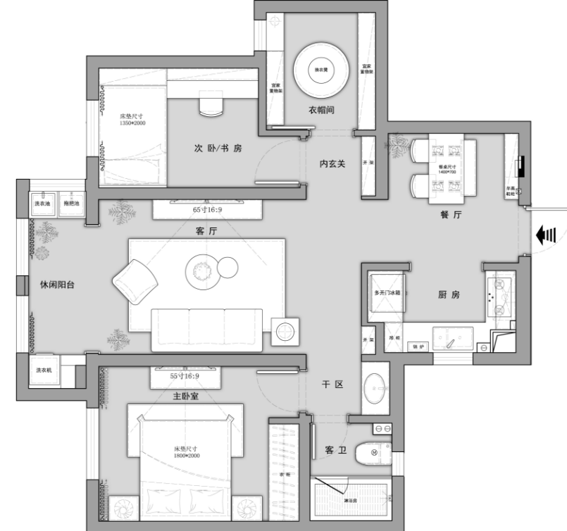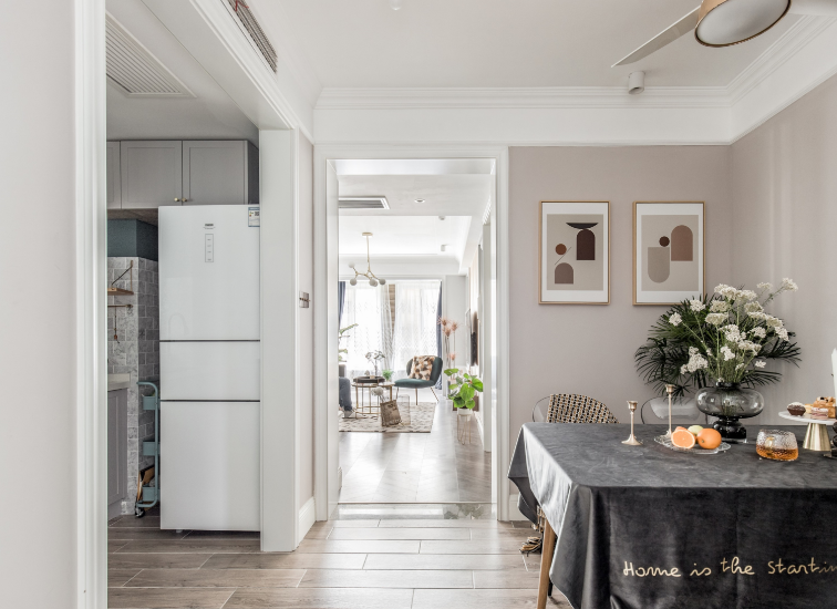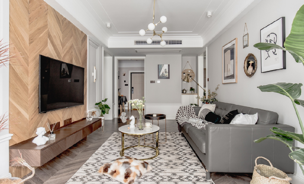 空间整体以素色为基础色调,木色的辅助色提升了精致感,营造宜室宜家的居住氛围。