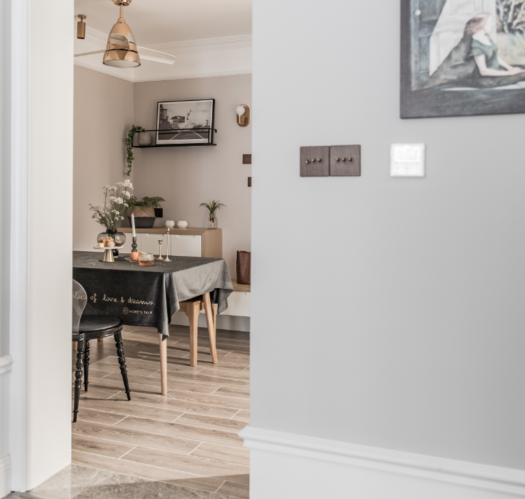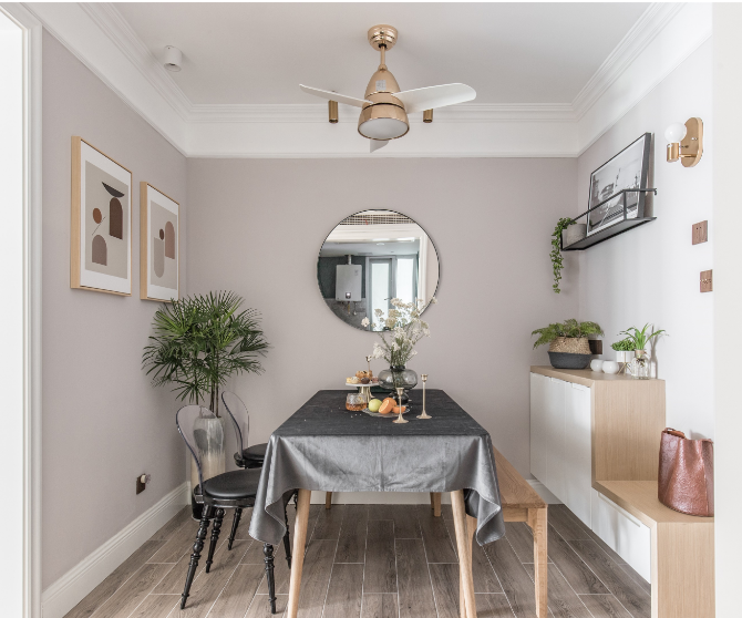 女业主特意强调餐厅要风扇,可能是为了怀念旧时的美好时光。我们特意挑一款和风扇结合的灯,照明纳凉两不误。
