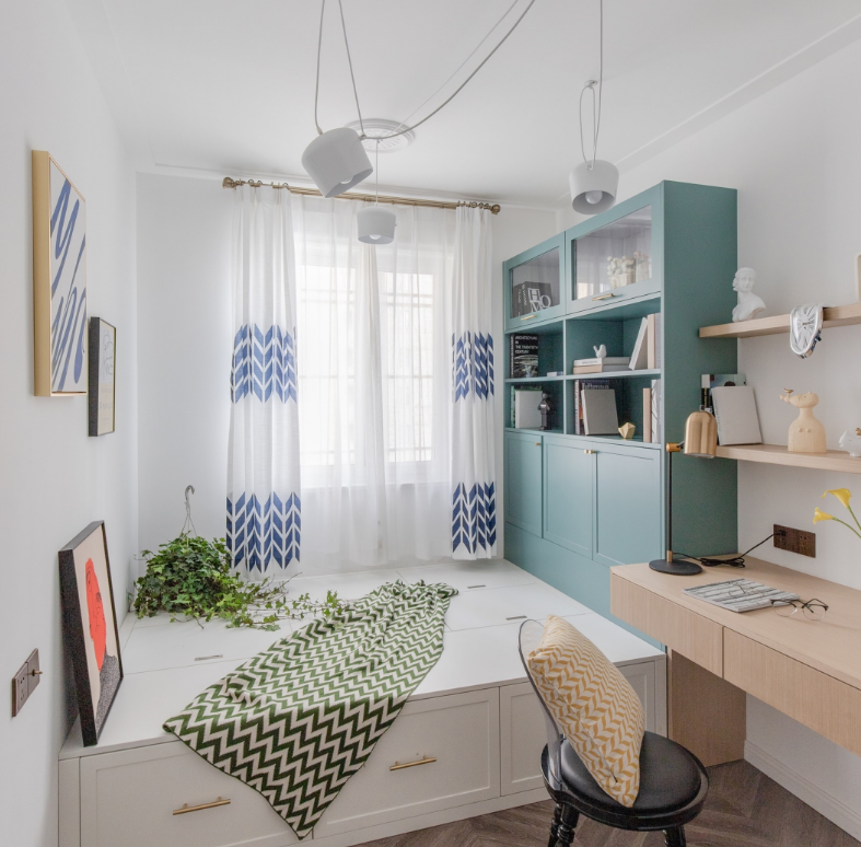 父母只是偶尔过来小住,次卧还是以功能性为主,榻榻米有效增加了空间的存储量,同时还兼具书房的功能,现在是父母居住,等有了小宝宝,亦可以作为儿童房更迭使用。