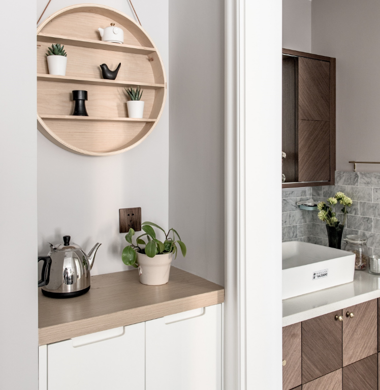 原本设计的内嵌微波炉柜被业主用来储物,放一盆绿植也是业主对生活细节的体现。