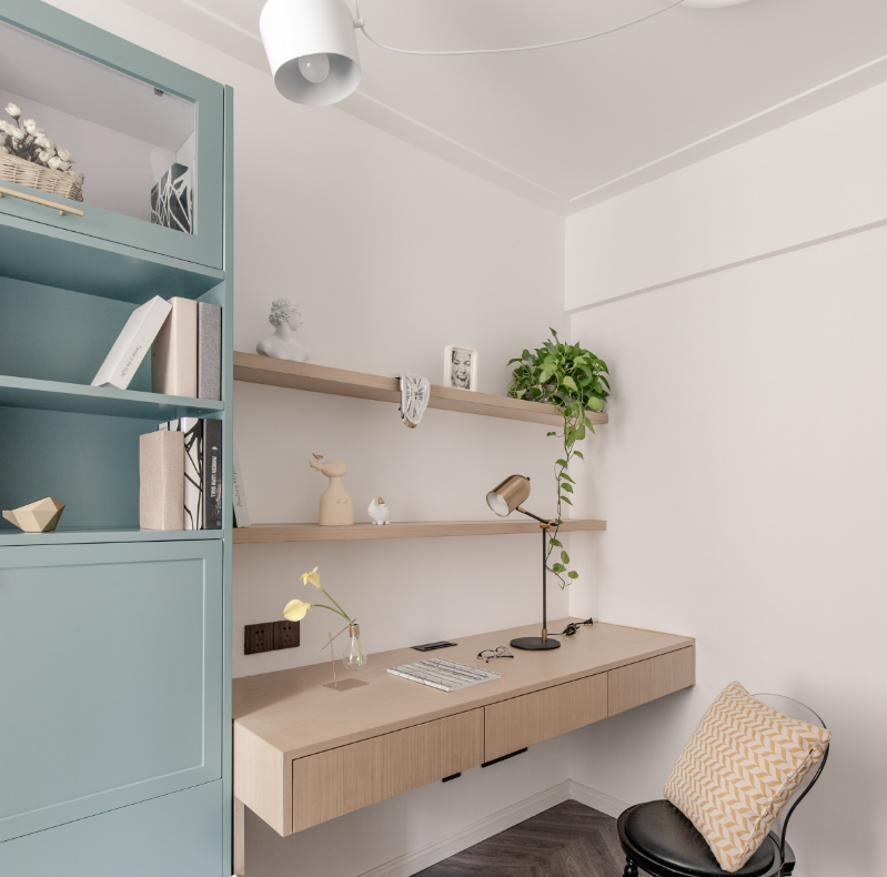 书房安静的氛围及展示区各种精致的摆件,都丰富了空间的精神及视觉感受。 书桌和书架均是现场制作,浅木色kd板饰面,无支撑架和无把手的抽屉,整洁干净