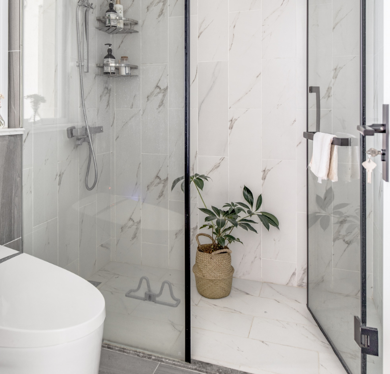 为了方便使用,设计师将干区独立出来,搭配隔壁的茶水台,让动线更加流畅。干区的大理石马赛克同样采用半高贴法,半砖半漆的设计可以在视觉上扩大干区空间。