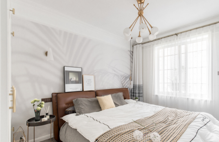 令人舒适的主卧空间,没有过多的装饰表现,淡淡的枝叶剪影素色壁画,大面积留白的墙面,为的是一份慵懒撒入室内的阳光及那还在追逐的梦想。