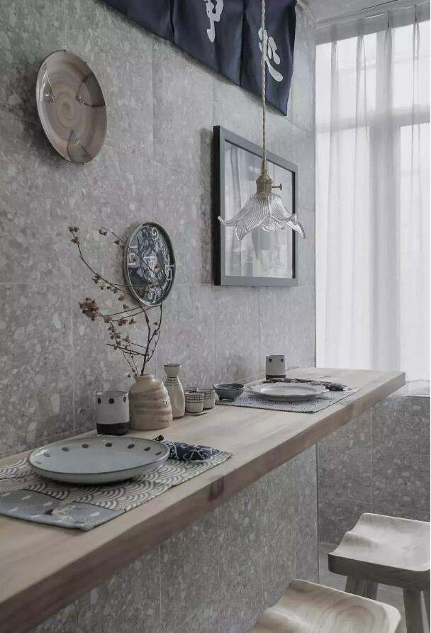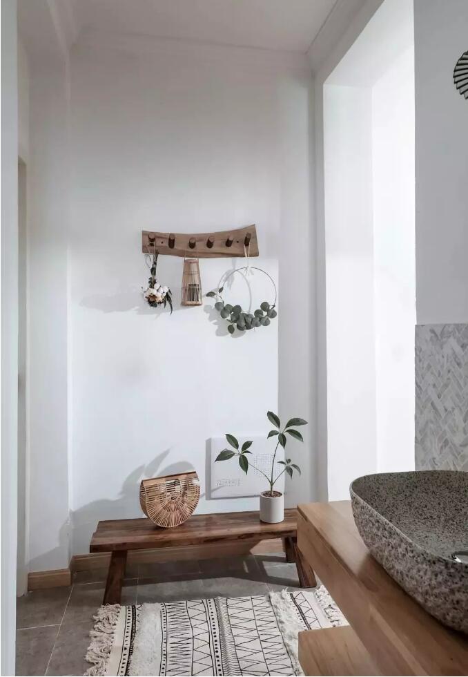 进屋的玄关并没有做太多的柜子,而是仅仅保留了一个换鞋凳。在墙面上利用原始的树枝板材拼接做的的挂钩,挂一些简单的饰物或者衣帽简单方便。灰色地砖点缀一块地毯,让整个空间都温馨舒适。