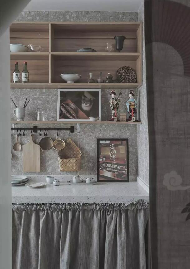 设计师为了满足业主的居住要求,取消了原本的独立餐厅在原有餐厅的基础上设计出两居室的格局。厨房和餐桌吧台在同一感觉里,操作台上方的挂钩与开放式收纳,整体布置错落有致,而操作台下的地柜则是以布帘遮挡。在家里偶尔做点美味小点心,配上一杯美酒。情趣又温馨。