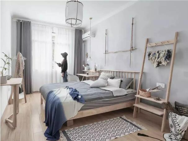 卧室以浅灰色的床头墙,简洁的原木质地板与床铺衣帽间梳妆台等,统一的原木色,让空间显得原始自然好惬意。床头墙的麻绳与树枝装饰,还有侧边的干花与手工制品,简单的元素混搭在一起,营造出一个独特的温馨氛围。极简的原木梳妆台,布置上陶艺花瓶,还有一盏台灯与吊灯,简单的布置流露出独特的文艺感。