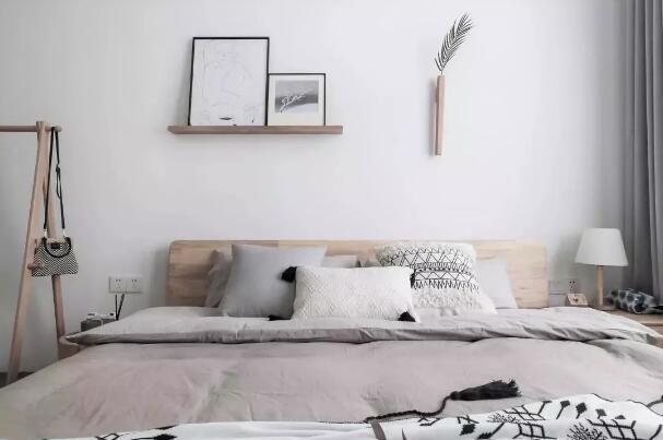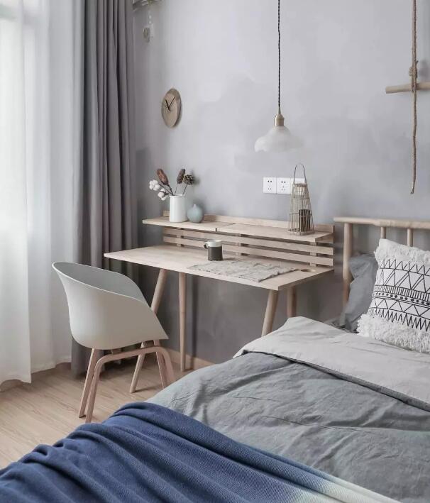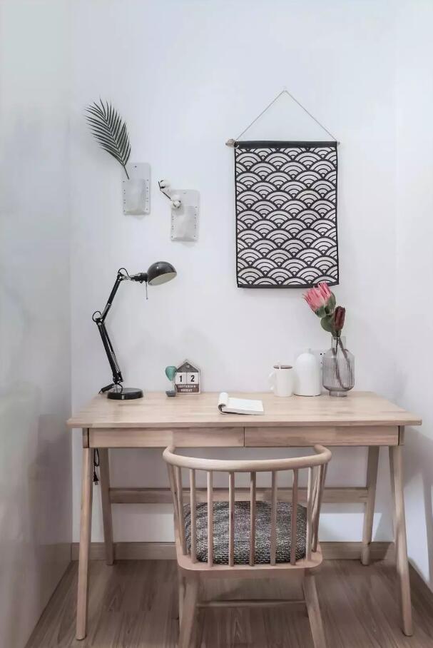 次卧也是以简洁的空间为主,整体净白的空间搭配木质的家具,带来清爽舒适的氛围感。床头墙的搁板展示架摆上装饰画,旁边的挂了一条直形的木质插枝,简简单单的布置也显得别有一番情趣。独立的小工作台,墙面的布艺收纳,简单布置的台面,带来的是舒适小角落。